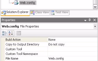 To avoid that you web.config file is automatically copied when you click on “Publish…”, you have to open the properties of the web.config file and set the properties Build Action to None and Copy to Output Directory to Do not copy (see figure).