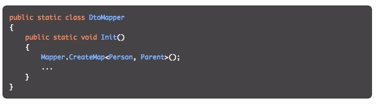 To come back to ASP.net MVC. You could now invoke the DtoMapper.Init() where appropriate (i.e. in the Global.asax or the controller constructor) for initializing the mapping configurations. The controller method then looks as follows