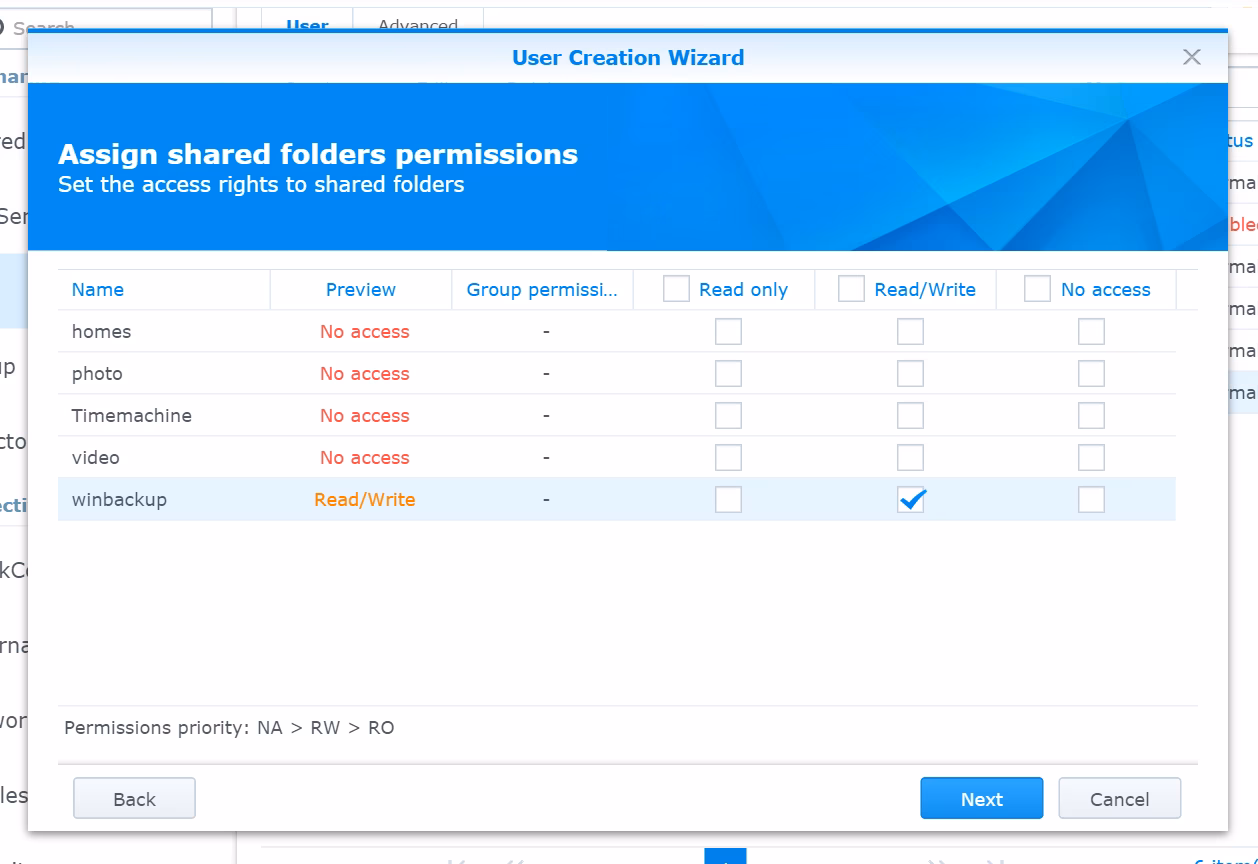 Note: This approach is useful for imposing different quota limits to the backup and your “usual” Synology account. For instance, I normally use an account “juri” to my disk station, for deploying files, videos, photos and so on. I wouldn’t want to share the quota of that account with the one used for backups. Since you can only impose quotas at the account level I tend to create a different ones.
