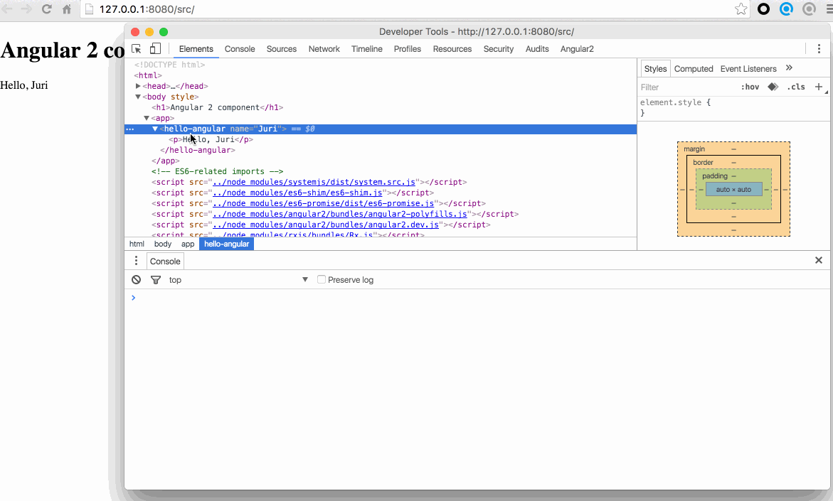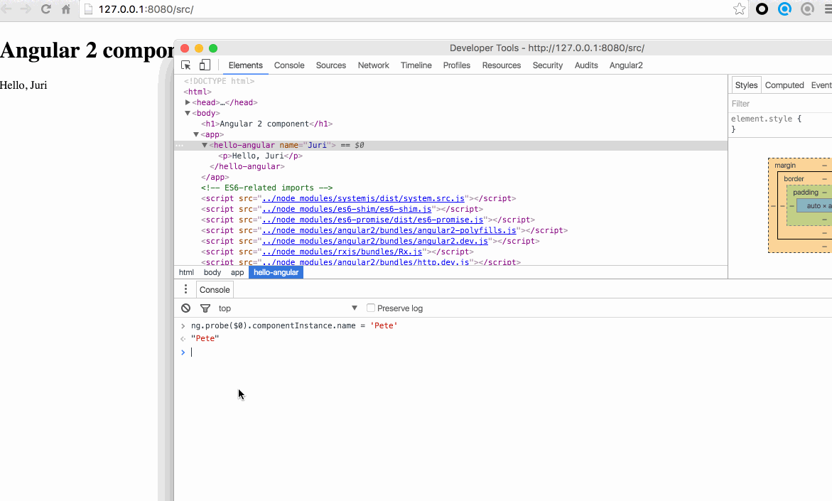 Note, if you’re using Angular beta.02 or lower, you have to explicitly activate debugging by importing the ELEMENT_PROBE_PROVIDERS from angular2/platform/browser and pass it as provider to your bootstrap function.