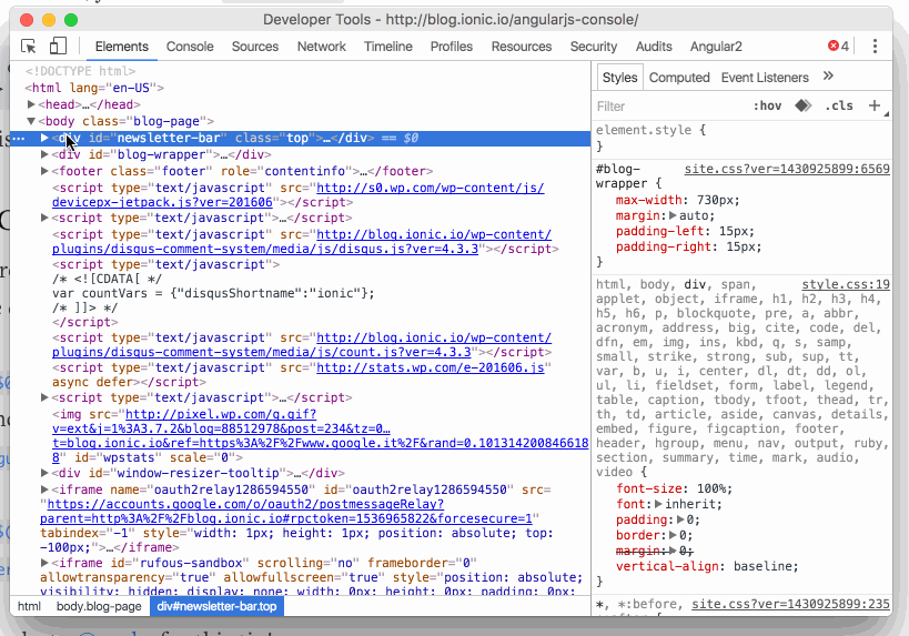 I always found it quite neat how to debug my Angular 1.x applications directly from my browser’s console. Take Chrome’s devtools for instance. You can open the Elements tab and click on your Angular component. The nice thing about the Chrome devtools is that it’ll keep a reference to the selected DOM node in the variable $0 which you can then directly access from the console.