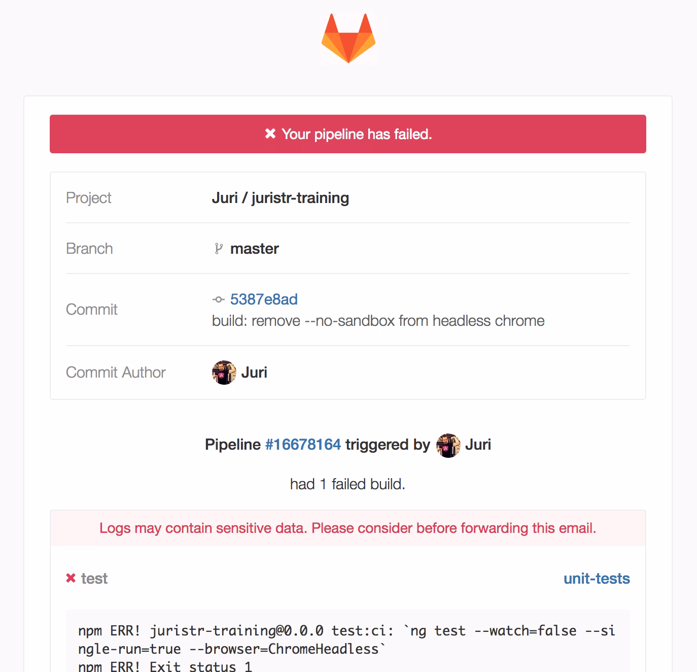Build on every commit - The main benefit of an automated pipeline is to get feedback as early as possible in the process. Thus, build every commit, regardless whether it’s to master, or a PR. Whenever something fails, GitLab (or every other CI server) will send the commit author some nicely formatted message about what happened, so that you can immediately react: