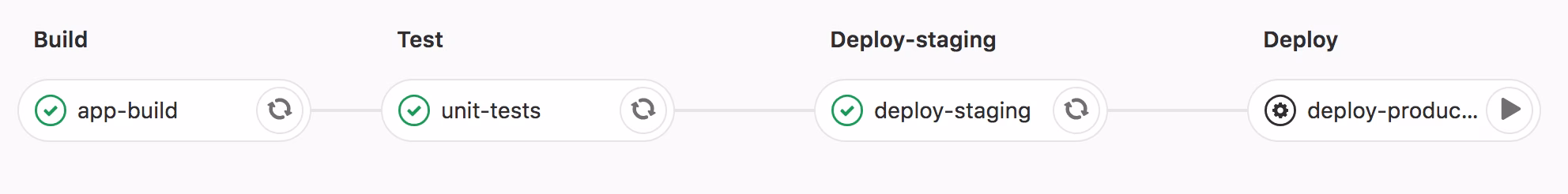 GitLab also nicely keeps track which commit has been deployed to which environment, also showing the play button here as well, which allows us to promote a given build from staging into production.