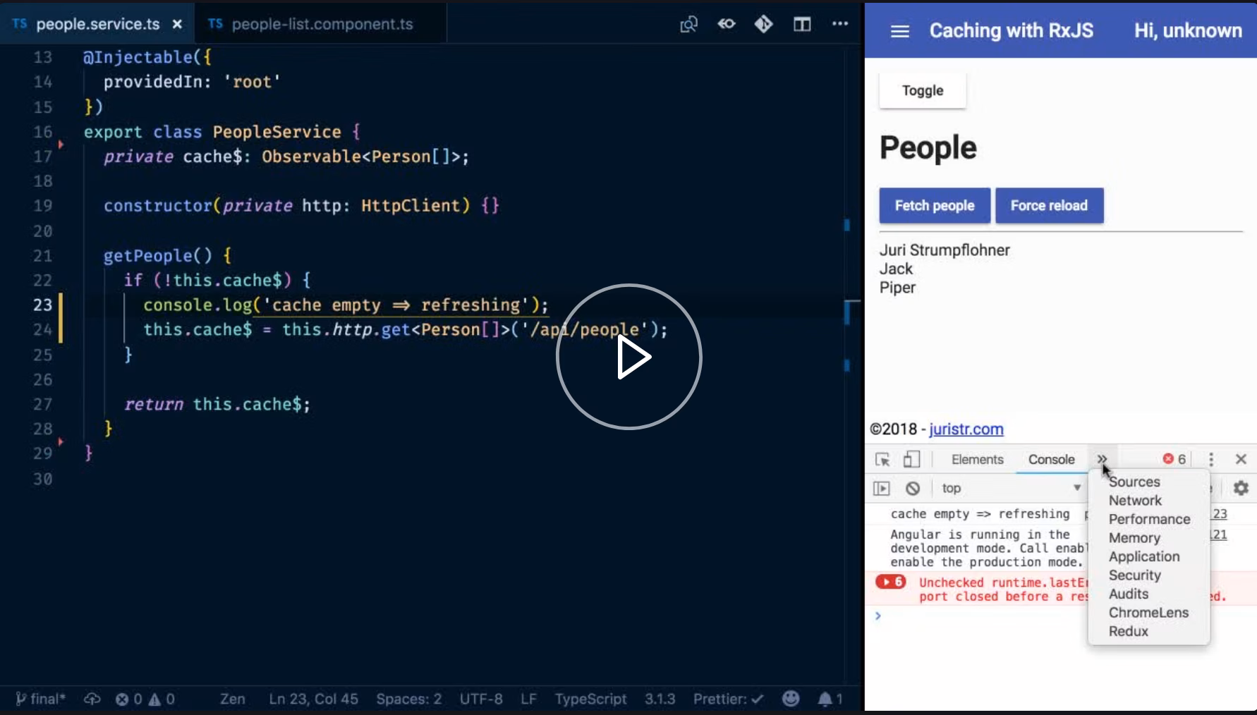 In this article I’m not going to deep dive into it, there are lots of articles out there. Especially the one on Advanced Caching with RxJS from Dominik from the Thoughtram team. I just recorded a video session for Egghead, largely based on his article and implementation of a simple caching mechanism with RxJS.