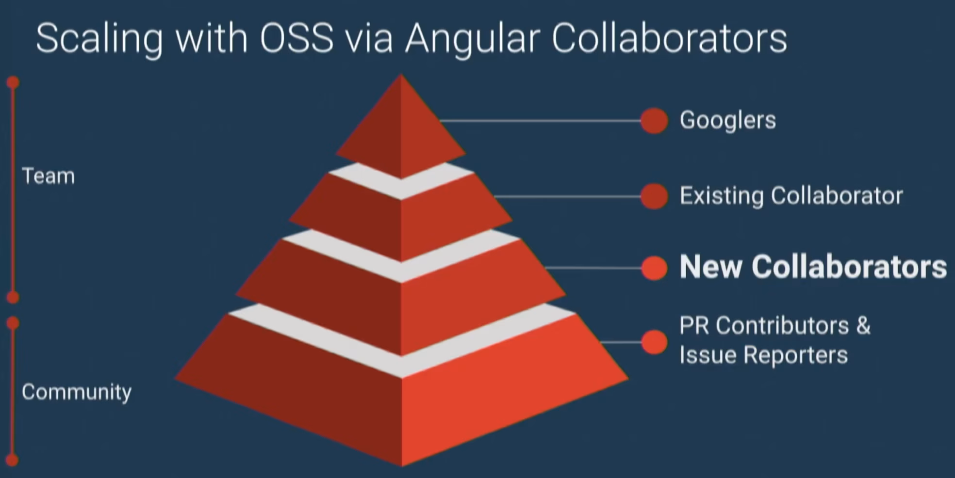 The Angular ecosystem grows and grows and more PRs come in from OSS contributors. In order to make sure the team doesn’t get overwhelmed, but still helping those PRs successfully land, it needs to find a strategy for scaling these efforts. Thus, Angular Collaborators has been launched. They are basically in the following part of the “hierarchy” (what a bad word).