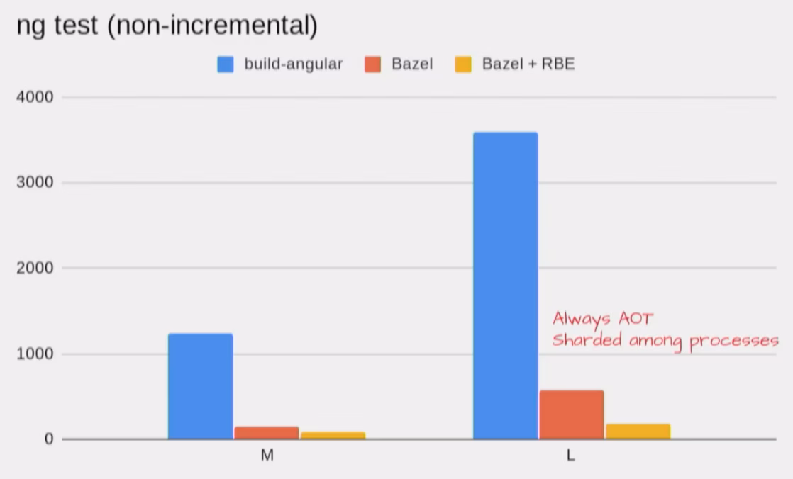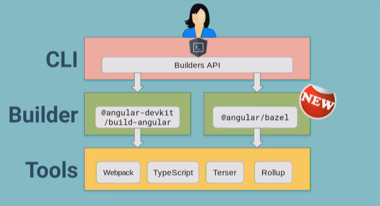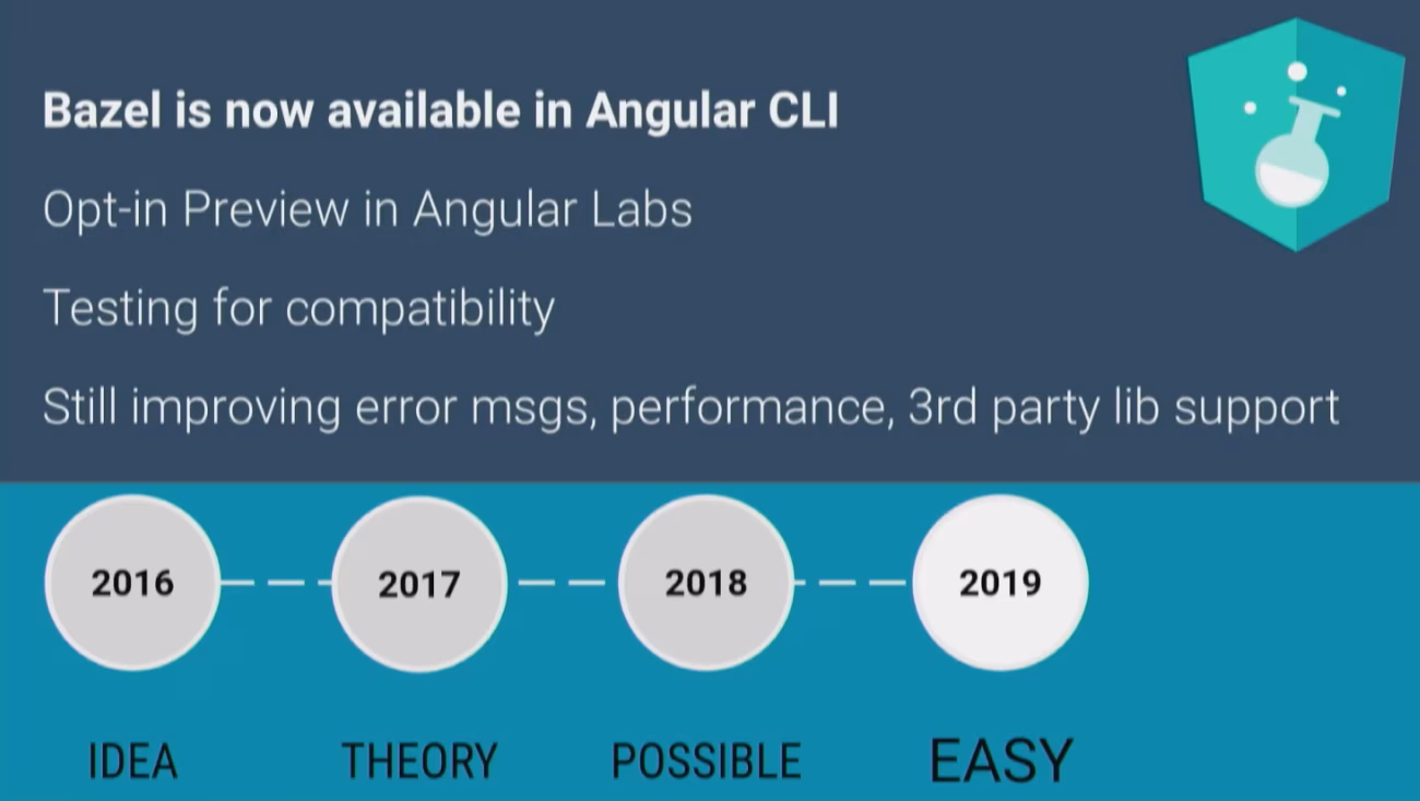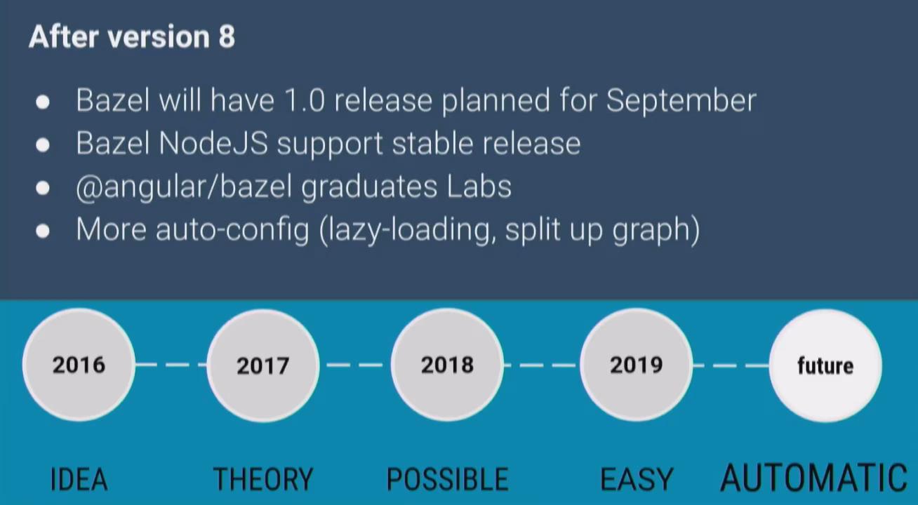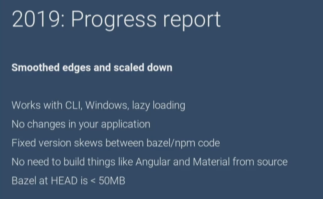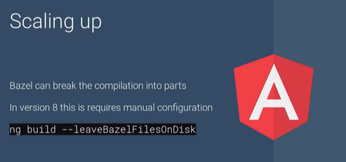 A dedicated team within the Angular team is currently working on bringing Bazel to the Angular community s.t. we can all benefit from such a super-power build tool. Currently it’s still an “early version” which can be used and works already, but is still a bit rough. By Q9 the goal is that everyone will be able to basically just enable a flag on the CLI configuration and Bazel will take care of the build rather than Webpack (something like that. details are still in the works ofc).