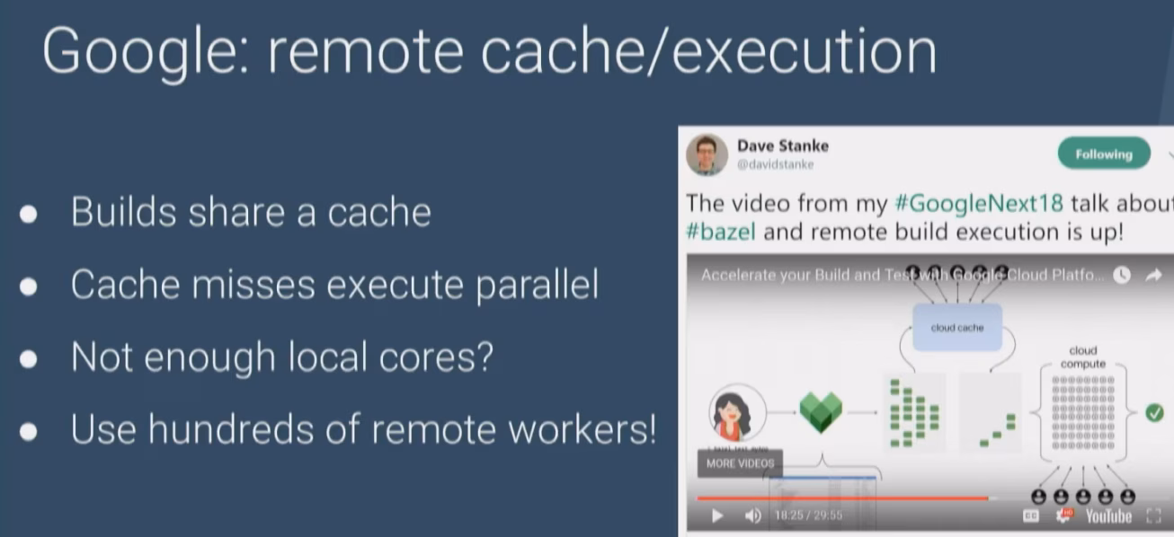 Bazel is one of those. It’s the open source version of Google’s internal “Blaze” build tool that powers its huge internal monorepo. Bazel is known for being extremely fast, especially due to its ability of allowing it to scale on the cloud as well (Google has an internal requirement that on average a rebuild of any codebase size should never take longer than ~3 secs :scream:)