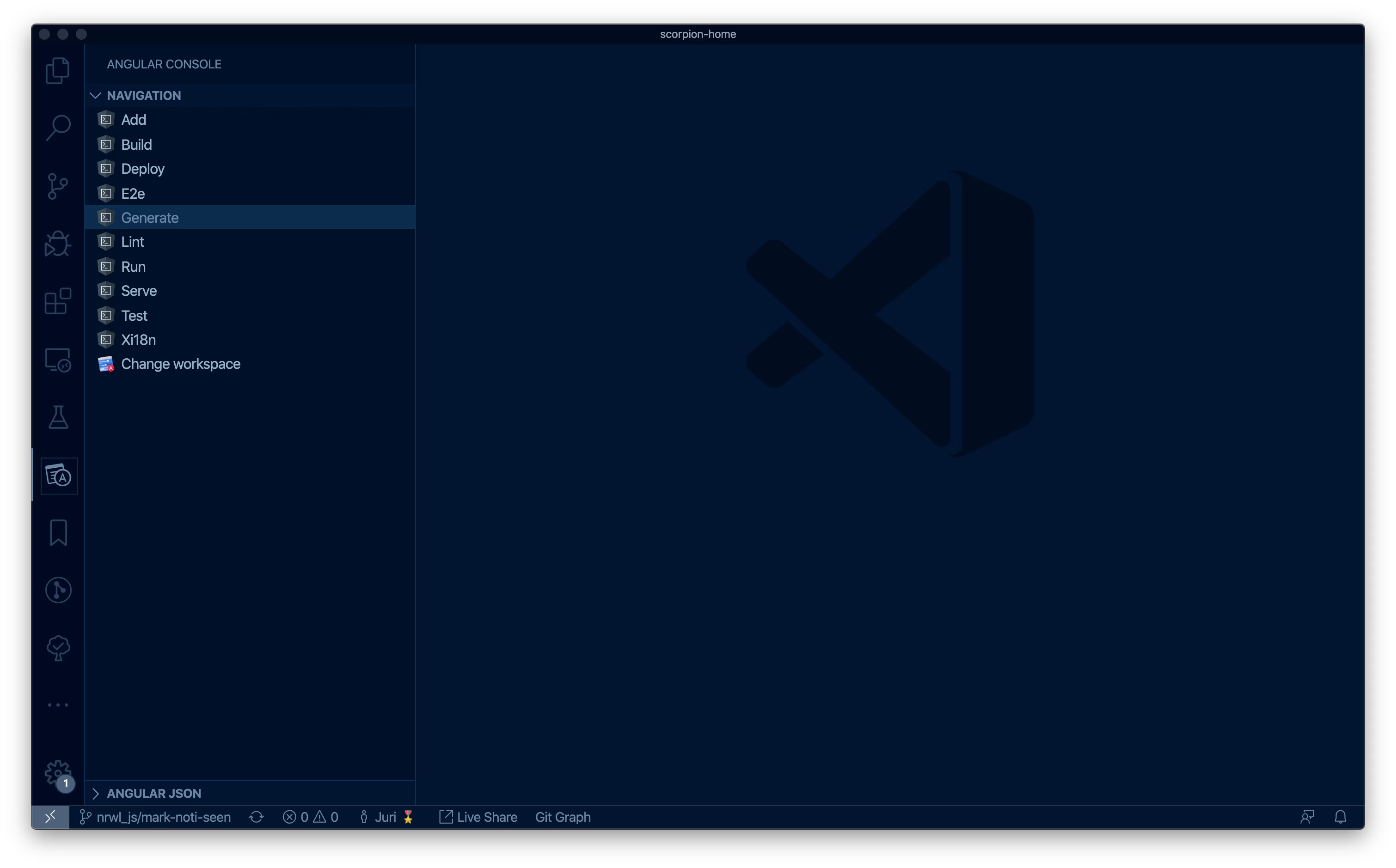 Nx Console is a Visual Studio Code extension for Angular and Nx. If you’re not the CLI type of person, then this might be for you. Nx Console automatically finds available schematics in your workspace, thus allowing you to easily control and execute Angular CLI / Nx commands from a nice UI interface.