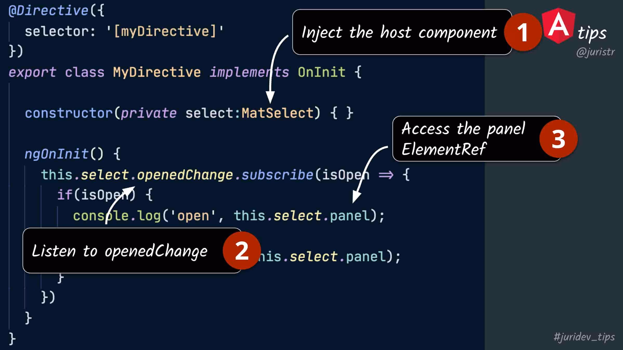 We only need a way to get access to the MatSelect instance from within our directive, s.t. we can grab the panel reference and perform our query. The by far easiest way (and surprisingly many devs don’t know about this) is to use Angular’s dependency injection. By requiring the instance in the constructor, Angular will take care to inject the host/parent component.