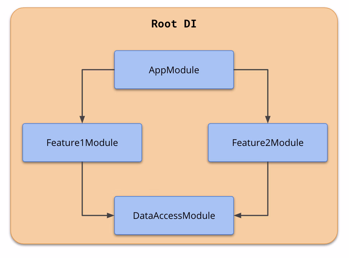 Reusing our previous example, once Feature1Module imports DataAccessModule, the DataService is registered on the root injector and globally available. Meaning if Feature2Module requires DataService it’ll work without exception, even though Feature2Module did not import DataAccessModule (where DataService is registered). I do not recommend relying on that though!
