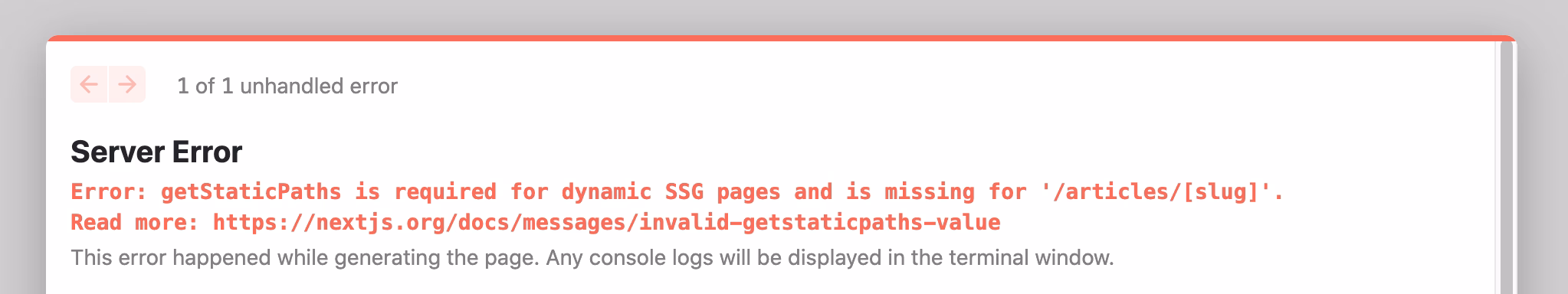 Whenever we have a dynamic Next.js route, we need to get the path of the route to find the corresponding markdown file. If we don’t implement it, we get the following error: