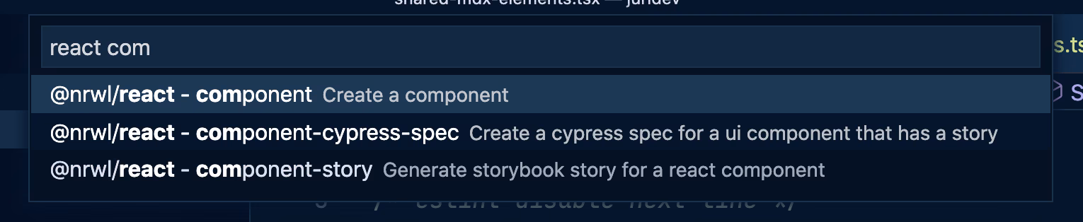Using Nx Console, we search for “React component”