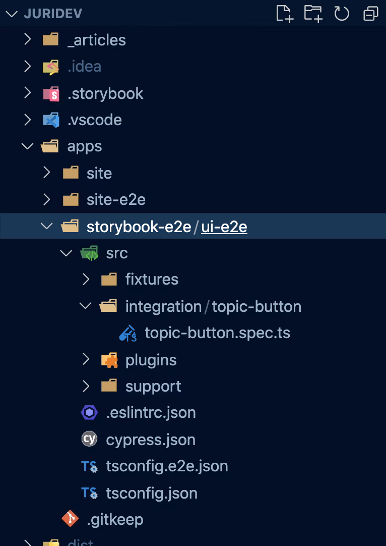 Similarly to the Next.js app based e2e tests, Nx also generated e2e tests specifically for our Storybook setup, which we generated in the previous article. All those tests reside in the apps/storybook-e2e/ui-e2e folder. The reason why they are in a separate “storybook-e2e” folder is because I specifically passed that as the Cypress directory when generating the Storybook setup.