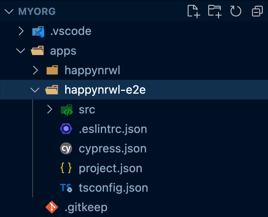 Whenever you generate a new project in an Nx workspace, you have the option to automatically also create a Cypress-based e2e project alongside it. In our case, it is called happynrwl-e2e.