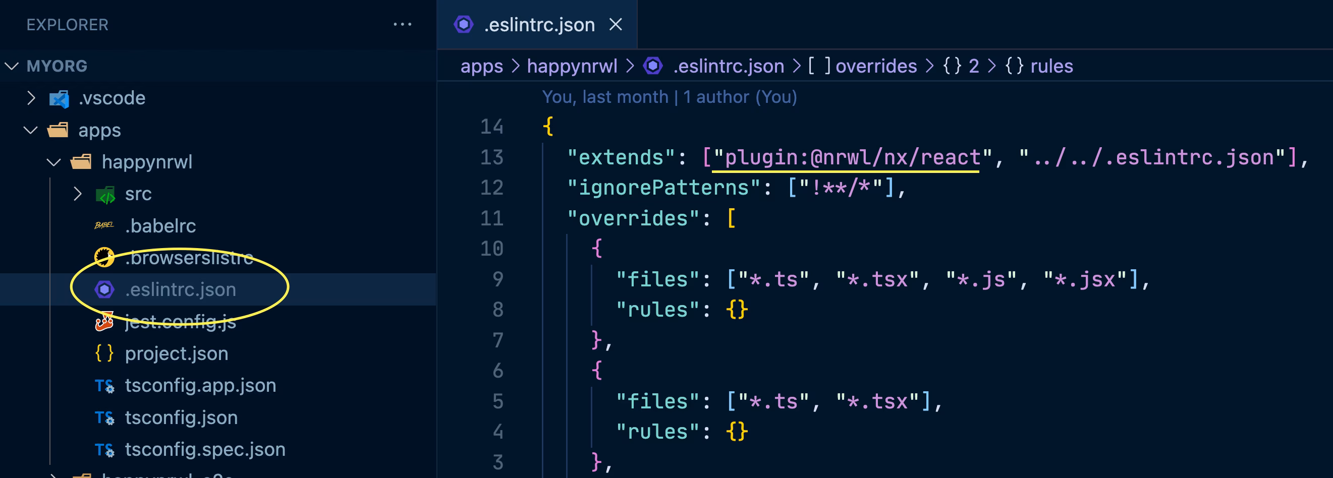 Every project generated by Nx comes with a .eslintrc.json file. That configuration extends from an ESLint plugin @nrwl/nx/react , containing a set of best practices rules, and at the same time allows you to add further rules that are specific to your needs.